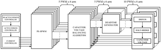 PS-SPWM requires five carrier signals to generate the gate signals of a six-level converter. Figure 16 shows the block diagram of the per-arm implementation of the modulation algorithm. Each carrier signal is generated by the “PWM carrier generation” blocks, which allow programmable phase shift and frequency. The carrier signals are compared with the arm voltage reference and, then, five master gate signals are generated. Figure 17 shows the full control diagram. Six blocks are required (one for each arm) in order to generate the PWM master signals from the six voltage references. These master signals are modified by the capacitor voltage balancing algorithm and then inverted by a dead-time controller which generates the rest of the PWM signals. Finally, the PWMs signals are applied to the SMs’ IGBTs.