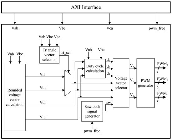 The core receives the three line voltages and, then, the block namely ‘Rounded voltage vector calculation’ calculates eight possible rounded vectors according to (3). The third vector, Vll or Vuu, is chosen from (4). The duty cycles are obtained using Vab and Vbc voltage reference signals and the three aforementioned voltage vectors by using (5) and (6).