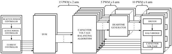 The next step is to calculate the voltage levels of each phase to generate the corresponding output voltage level. The phase voltage is obtained from the three voltage vectors (see Figure 4). The sawtooth signal is used to switch the output between the three voltage vectors using the duty cycles calculated above. Finally, the output voltage reference is applied to a PWM generator in order to generate the gate signals for the IGBTs. The gate signals are generated depending on the amplitude of the voltage reference and a circular array is used to rotate the switching pulses in order to distribute the switching losses. Figure 19 shows the SVM full control diagram. Two blocks are used (one for the upper arm and one for the lower arm) in order to obtain the PWM master signals which then are introduced in the capacitor voltage balancing algorithm with the objective to balance the capacitor voltages. Finally, the remaining PWM gate signals are generated by the dead-time generator.