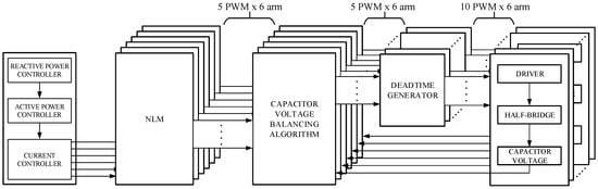 A sawtooth signal with programmable frequency (pwm_freq) is used to switch the output between two levels VN and VN−1. The range of the signal is (0, 1), thus, it can be directly compared with the duty cycle and therefore the right voltage level is generated. Finally, the gate signals are generated depending on the amplitude of VN and VN−1. As in the previous case, a circular array is also used to distribute the switching losses. Figure 21 illustrates the NLM full control diagram. In the same way as in PS-SPWM, six blocks are necessary to generate the PWM master signals. Then, they are modified by the capacitor voltage balancing algorithm and inverted by the dead-time controller in order to obtain all the PWM signals which are then applied to the IGBTs.
