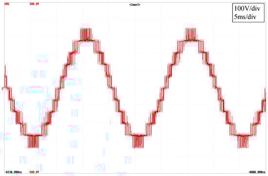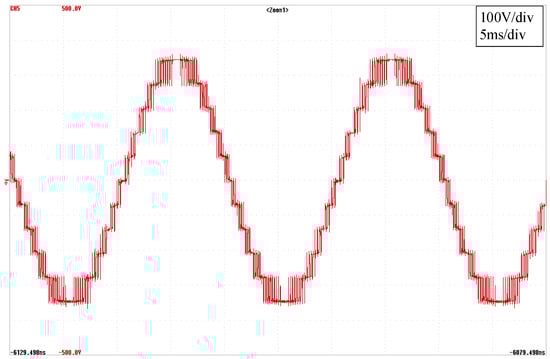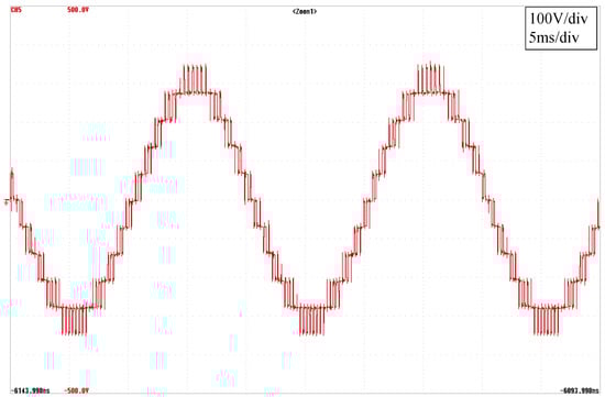Two experimental tests have been carried out in the prototype above-mentioned. The first test consists of measuring the output voltages without any connected load. The objective of this test is to measure the output voltages without the influence of inductances that could filter the generated harmonics. Figure 22, Figure 23 and Figure 24 show the line-to-line output waveform obtained using the PS-SPWM, SVM and NLM respectively. As can be seen, the three modulation techniques properly generate the waveforms.