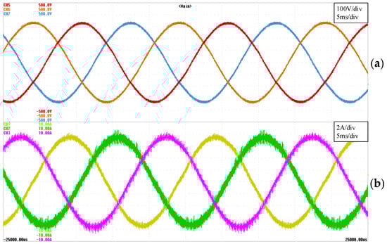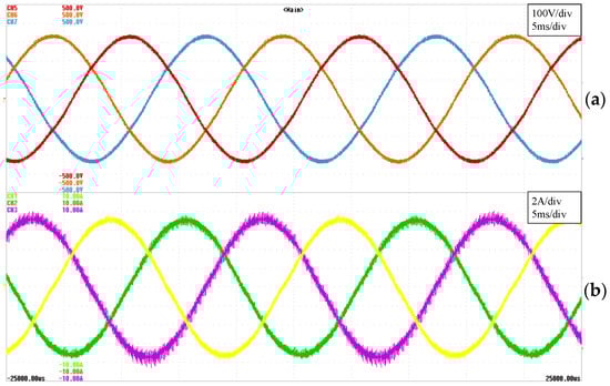 PS-SPWM operation with a 2 kW load. (a) line-to-line output voltages and (b) output currents.