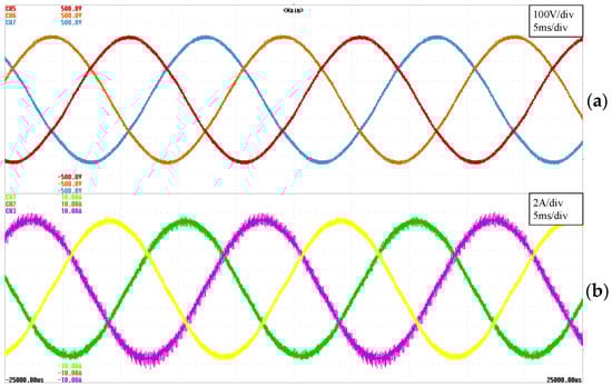 NLM operation with a 2 kW load. (a) line-to-line output voltages and (b) output currents.