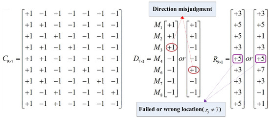 The direction-judgment at will be incorrect if or . The same observation applies for the result obtained at , and two possible direction-judgments at can be obtained according to the components of shown in Figure 8. The direction-judgment at will be wrong if or .