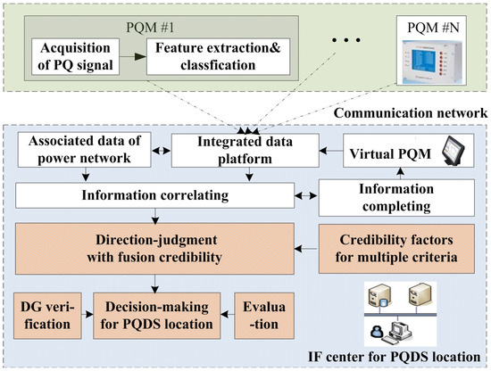 To locate the TVDS with better reliability and accuracy in the smart distribution grid, the following information can be utilized: (1) the credibility of direction-judgment corresponding to different influence factors should be integrated; (2) the influence of DG integration to direction-judgment should be verified and corrected; (3) multiple applicable criteria of direction-judgment for one same type of TVDS could be integrated as multi-evidences fusion; and (4) other important information, such as grid’s topology, PQ measured data, layout of PQMs, and parameters of gird’s components, among others, should be integrated for PQ information completing and correlating. Considering these multi-source information and evidences with different properties, the existing matrix-based methodologies for TVDS location cannot provide good performance. Information fusion (IF) techniques [22] can improve the decision-making process in an uncertain environment by the fused information with correlative and integrative properties.