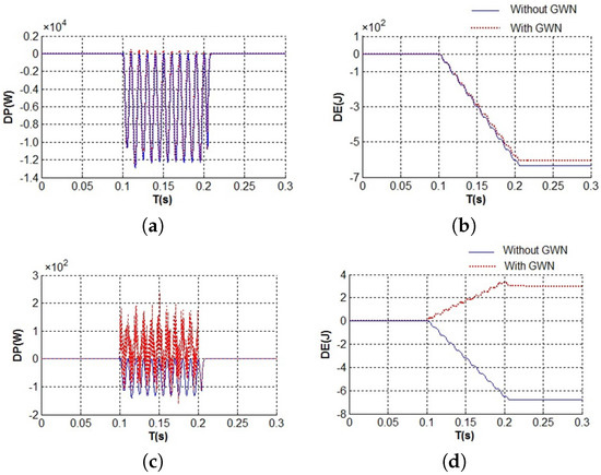 Suppose that a voltage-sag event caused by a single-phase grounding fault occurs at in Figure 1, where a Gaussian white noise (GWN) with the same intensity is added. As shown in Figure 4, the impacts of the GWN on the direction-judgment are different at and . Figure 4a,b show that only the disturbance signals be changed slightly at , but the direction-judgment is not affected. Meanwhile, the PQ disturbance intensity at was quite weak, and thus we observed the misjudgment caused by this noise as shown in Figure 4c,d.