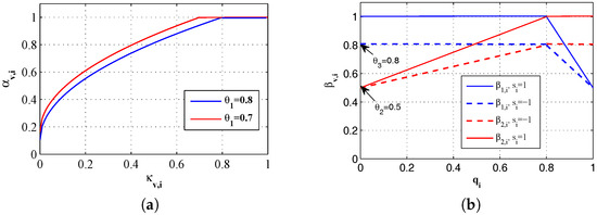 Figure 7 shows the distribution characters of with different λ and k. The drop of is mainly determined by the parameter choice of λ. When λ is fixed, the credibility values at the middle point, i.e., , are the same despite different values of k. Meanwhile, the credibility values at another critical point, i.e., , is significantly influenced by different k. Considering the requirements of the credibility function and the distribution characters of , this paper considers the choice of and . We also have where in the range of .