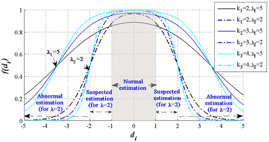 A larger means larger deviation between the two estimation results, and thus a lower credibility should be assigned. can be considered as a normal estimation point if , or an abnormal estimation point if , or suspected estimation point if .