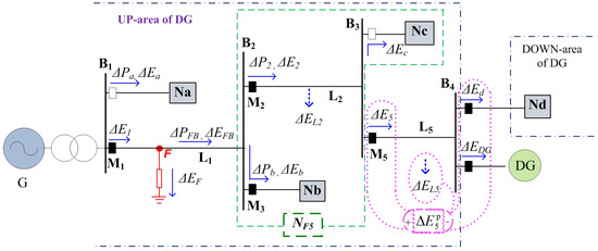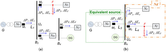 In Figure 8, we introduced the following notions: (1) denotes the path from arbitrary component A to B in the grid; (2) is the link between G and DG, i.e., ; (3) is the link between DG and TVDS, i.e., ; (4) is the bus connected to TVDS at the side of DG; and (5) is the current-dividing network that includes all the partial networks and lines between and . In addition, and are the DP and DE values at , and are the voltage variations at F and bus in Figure 8 during the voltage-sag event, is the DE value at TVDS, and are the DP and DE values transmitted from TVDS to , and and are the DP and DE values absorbed by .