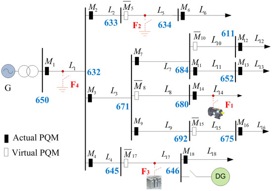 Figure 14 shows the topology of an IEEE 13 node test feeder with a nominal voltage of 115 kV/4.16 kV and a nominal power capacity of 5000 kVA [30]. There are 18 lines in the system, numbered from to . For the NPQMS, the monitors marked in Figure 14 include both 13 actual PQMs and 5 virtual PQMs ().