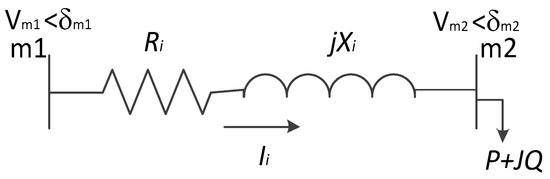 where and , are the real and reactive powers of the branch interconnecting bus m1 with bus . and are the real and reactive loads at bus . and are the voltage profiles of the buses and respectively. are the resistance and reactance of the branch i. is the current flowing from to . The power losses across each branch and of the whole system can be computed using Equations (6)–(8):