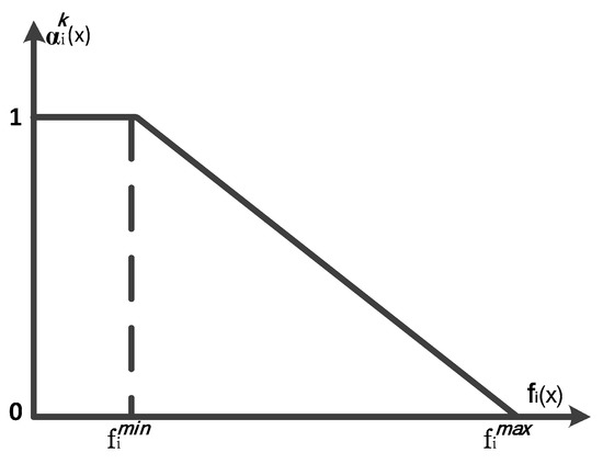 In order to get the best compromise solution from non-dominated Pareto-front solution, fuzzy decision model is proposed. For every solution in kth Pareto-front, the linear membership function is introduced, which represents the proper goal of ith objective function. Figure 4 shows the linear membership function trend and mathematically can be expressed in Equation (26).