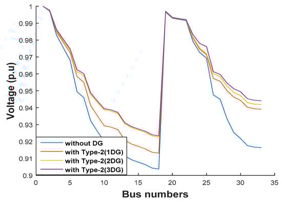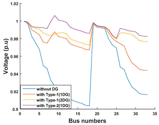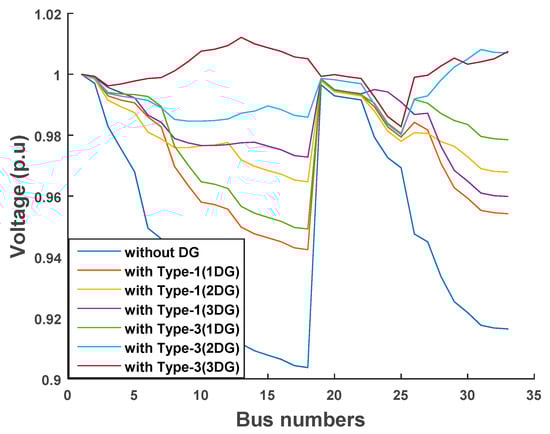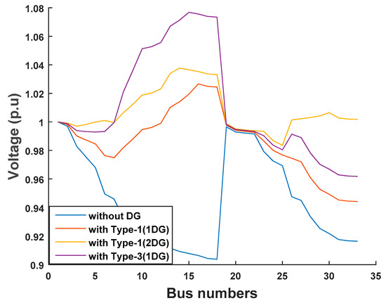 Voltage profile for Type-1 (1 DG and 2 DG) and Type-3 (1 DG).