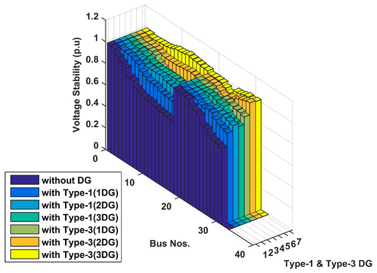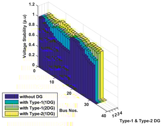 Voltage stability for Type-1 (1 DG and 2 DG) and Type-3 (1 DG).