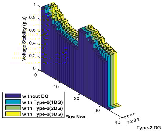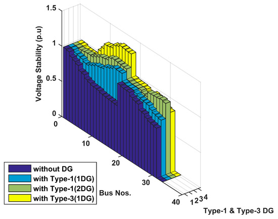 Moreover, Figure 17 shows that with the installation of Type-1 ( 1 DG) and Type-1 (2 DG) the minimum voltage stability is improved upto 0.7970 p.u and 0.9129 p.u at bus 31 respectively, while maximum voltage stability is improved upto 0.99269 p.u and 0.9944 p.u at bus 2 respectively. With the installation of Type-3 (1 DG), the minimum voltage stability is improved upto 0.9353 p.u at bus 31 and maximum voltage is improved upto 1.00 p.u at bus 9,10 and 11 respectively.