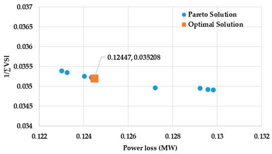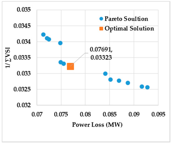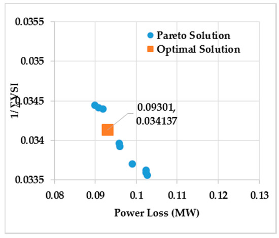 In order to check the validity and performance of the proposed method, the proposed method is extended by hosting 2 DG for Type-1 and 1 DG for Type-3. The numerical outcomes of Type-1 (2 DG) and Type-3 (1 DG) and its compared results with BSA and GA are shown in Table 8. The pareto-optimal solutions of these Type-1 (2 DG) and Type-2 (1 DG) are shown in Figure 14 and Figure 15 respectively.