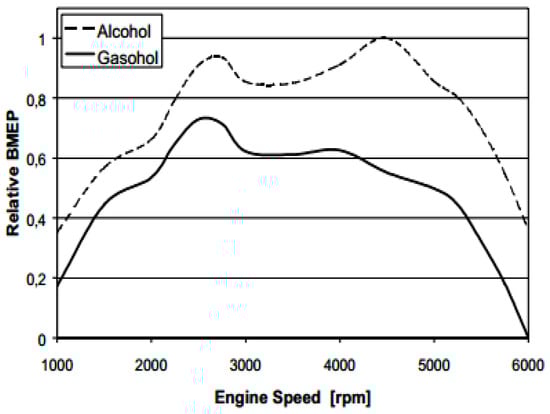 Experimental work carried out by Schifter et al. [6] investigated the effect of using gasoline‑ethanol mid-level blends (10%–40% anhydrous or hydrous (4% water content in ethanol)), in a single-cylinder SI engine. The results showed that higher pressures and lower intake manifold temperatures were obtained with the use of hydrous ethanol blends in comparison with the use of anhydrous ethanol blends and led to increased volumetric efficiency. Furthermore, hydrous ethanol blended gasoline decreased the combustion speed, combustion duration, and the heat release rate. In addition, the results revealed an increase in the indicated mean effective pressure (IMEP) for hydrous ethanol blends over anhydrous ethanol blends. For rich air-fuel ratios, the use of hydrous ethanol results in higher power outputs than anhydrous ethanol. Moreover, the fuel consumption by mass slightly increased using the hydrous ethanol. In the work of Clemente et al. [8], the peak torque and peak power for hydrous ethanol (7% water concentration) was enhanced by 9% and 14% respectively in comparison with the blend of gasohol (22% ethanol and 78% gasoline). The increase in peak torque and peak power output for hydrous ethanol is related to one reason, hydrous ethanol allows working with more advanced ignition points aiming for maximum brake torque (MBT) conditions, so a mixture with 78% gasoline was knock limited, while hydrous ethanol worked at the MBT operation point. The authors also described that the specific fuel consumption for hydrous ethanol was increased by 35% compared with the E22 fuel, because hydrous ethanol has a lower heating value than E22, with the brake mean effective pressure (BMEP) also being enhanced for hydrous ethanol (see Figure 1).