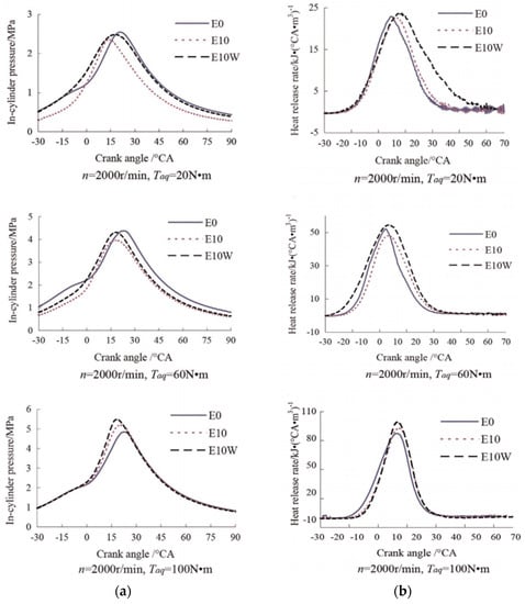 The variation of (a) in-cylinder pressure (b) heat release rate with crank angle for a fixed speed of 2000 rpm, and engine torque of 20 Nm, 60 Nm, and 100 Nm. (E0 = 0% ethanol & 100% gasoline, E10W = HE10 = 10% hydrous ethanol & 90% gasoline, E10 = 10% ethanol & 90% gasoline) [38]. Copyright (2015) Elsevier Ltd.