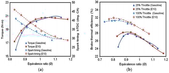 The variation of (a) Torque (b) Brake thermal efficiency versus equivalence ratio, at a fixed speed of 2500 rpm and 25% throttle opening. Reprinted and adapted with permission from Ref. [67]. Copyright (2012) John Wiley and Sons.