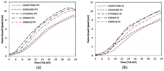 Flame growth speed for (a) PFI and (b) DI operation, for the first 24° CA of combustion at a fixed engine speed of 1000 rpm and an equivalence ratio 1. Reprinted with permission from Ref. [68]. Copyright (2014) SAE International.