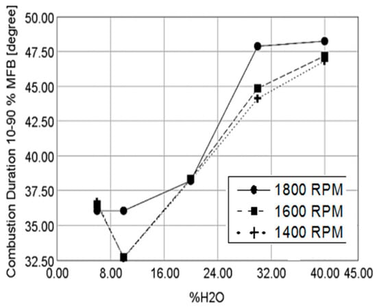 Effect of increased water content in ethanol on combustion duration (10%–90% of mass fraction burned) Reprinted with permission from Ref. [76]. Copyright (2015) SAE International.