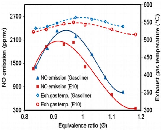 NO emission and exhaust gas temperature versus equivalence ratio, for a fixed speed of 2500 rpm and a 25% throttle opening. Reprinted (adapted) with permission from Ref. [67]. Copyright (2012) John Wiley and Sons.