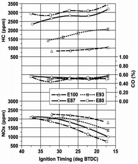 Experiments conducted by Liu et al. [49] investigated the emissions of HE10 hydrous ethanol gasoline blends and gasoline. The results showed that for hydrous ethanol blends CO and HC emission were lower for all loads, while NOX emissions were reduced for low load engine operation. At idling speed, the CO, HC and NOX emissions were all reduced. NO and NOX emissions were reduced for the use of hydrous ethanol gasoline blended fuel (HE40).While, the HC, CO and CO2 emissions showed a small reduction for the use of hydrous ethanol containing fuels compared with gasoline [50]. The higher latent heat of evaporation of the ethanol blends, and water present in it resulted in lower in-cylinder temperature, which in turn resulted in lower NOX emissions (see Figure 7). HC emission was also lower for HE10 at 25% throttle opening, which was due to the presence of oxygen in the fuel and a better combustion rate [67]. Brewster et al. [79] investigated a spark ignition turbocharged engine fueled by anhydrous (El00) and hydrous (E93W7, E87W13, E80W20) ethanol fuels. The results showed that the emission of CO was unchanged by the water content in ethanol, with a NOX emission reduction with an increase water content in ethanol at a fixed ignition timing, the key is the existing water, which lowers the peak temperature during burning and slows down the procedure of NOX formation. For similar operating conditions, there was an increase in HC emissions with an increase in water content for the E93W7and E87W13 fuels may be resulted in incomplete combustion, the trend being largely independent of ignition timing (see Figure 8).