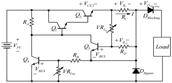 The present study adopted the circuit of a PV module simulator with adjustable shading ratios [27], as shown in Figure 1. The circuit structure primarily comprises a Darlington amplifier, a current limiting circuit, and a voltage regulator for attaining PV module output characteristics under varying shading ratios, which were created by adjusting variable resistors VRIsc and VRVoc. The variable resistor VRVoc shown in Figure 1 controls the open-circuit voltage of the PV module. When the circuit is open, a current-limiting transistor Q3 is operated at the cutoff region. The open-circuit voltage is calculated using Equation (1):