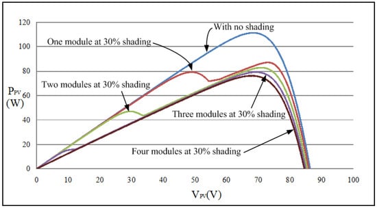 Simulated P–V characteristic curves of the four-serial and one-parallel array with different numbers of modules under 30% shading.