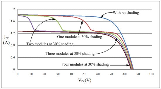 Simulated I–V characteristic curves of the four-serial and one-parallel array with different numbers of modules under 30% shading.