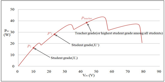 In Equation (4), if Xj,k_best and M remain unchanged, then Different_Meanj,k increases as TF decreases. According to the actual MPPT process of PV module arrays, the tracking increment is directly proportional to the distance between the individual student grades and the MPP. Therefore, if the student grades in Improvement 1 are X1 (i.e., power value P1) and X′1 (i.e., power value P′1), then the teaching factors TF of the student with the highest grades among all the students Xj,k_best (i.e., MPP value tracked so far Pk_best) are modified using Equations (9) and (10):