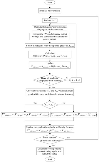 As depicted in Figure 4, the TF1 value decreases as the Different_Mean value increases when student grade is distant from the MPP (e.g., X1 position), thereby increasing the number of tracking steps needed to approach the maximum value rapidly. By contrast, when the student grade is close to the MPP (e.g., X′1 position), the TF2 value increases as the Different_Mean value and number of tracking steps decrease to approach the maximum value slowly. Thus, the students can adjust their tracking steps according to their learning capacity. In improvements 2 and 3, students can spontaneously learn from a student who is helpful to them. The term X′j,k-1(new) represents the student’s previous learning abilities, which is used as a basis for the other student’s self-study. In summary, the self-learning method not only accelerates the learning progress, but also escapes local solutions and reaches global convergence. A flowchart of the proposed I-TLBO MPPT is shown in Figure 5.
