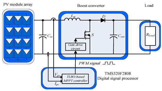 The measurement architecture is shown in Figure 6. First, the output voltage VPV and current IPV of the PV module arrays were extracted through sensors and signal conversion circuits and entered into the TMS320F2808 digital signal processor. Subsequently, TLBO was applied to perform MPPT. The resulting optimal duty cycle trigger signal was sent to the boost converter to control the on time of power transistors, thereby controlling the maximum power output of the PV module array.
