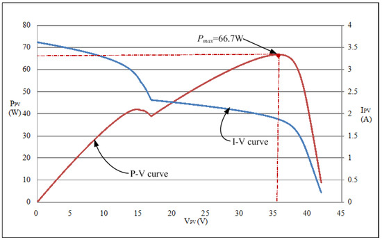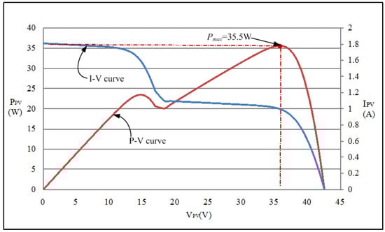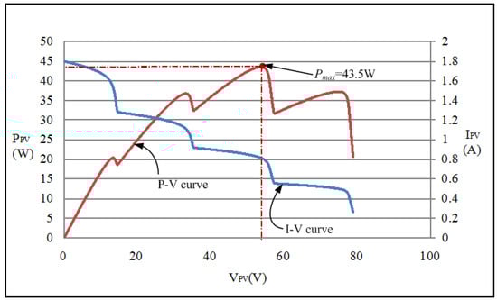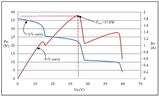 Figure 7, Figure 8, Figure 9, Figure 10 and Figure 11 depict the I–V and P–V characteristic curves of the PV module arrays under the five operating situations listed in Table 5. Figure 7 shows the output characteristics of a single PV module. The output characteristic curve reveals that the parameters related to the output characteristics of modules not affected by shading or faults are identical to the electricity parameter specifications listed in Table 1. The module in Figure 7 was used as a basis for testing the serial configurations (i.e., Cases 1–4) as well as the serial and parallel configurations (Case 5), as listed in Table 5. Different shading ratio conditions were set to produce multiple peaks in the characteristic curves to exemplify the exceptional performance of the proposed I-TLBO on MPPT. Figure 8, Figure 9 and Figure 10 reveal that double, triple, and quadruple peaks occur in Cases 2 to 4. Thus, we inferred that N peaks would appear in P–V characteristic curves when N modules in a serial array were under different shading ratios. Figure 11 shows the I–V and P–V characteristic curves measured on the two-serial and two-parallel configuration module array of Case 5. Although two modules in each serial module were subjected to different shading ratios, the parallel connection between the two-serial modules generated double peaks only in the P–V characteristic curve.
