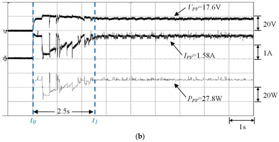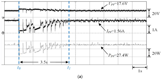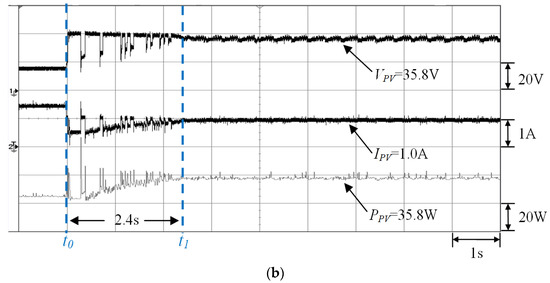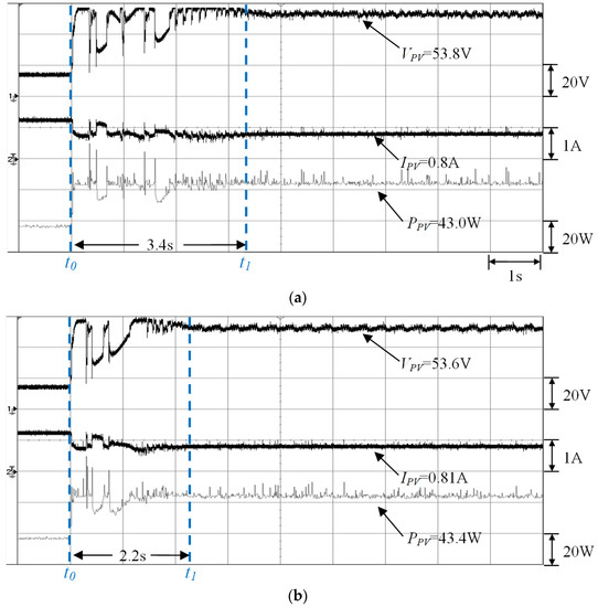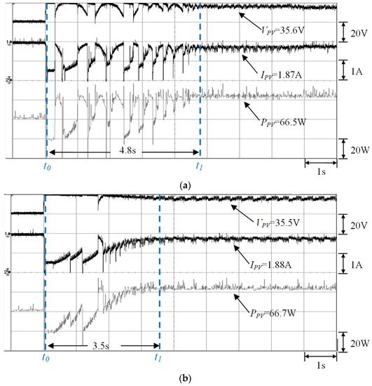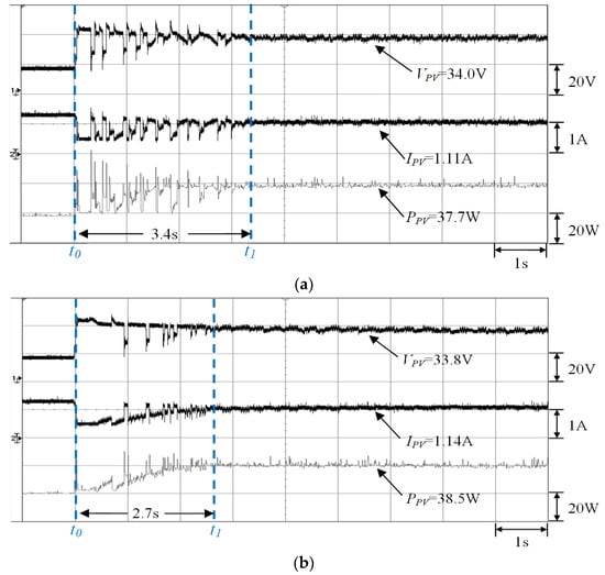 Figure 15a,b show the MPPT waveforms of Case 4 measured by using conventional TLBO and the proposed I-TLBO, respectively. The empirical results revealed that the proposed I-TLBO required only 2.2 s, whereas conventional TLBO required 3.4 s of tracking time (t0 to t1) to track the MPP. This validates that the proposed I-TLBO outperformed conventional TLBO in tracking.