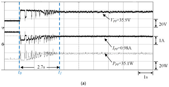 Figure 12a,b depict the MPPT waveforms of Case 1 (0% shading) measured by using the conventional TLBO and the proposed I-TLBO, respectively. The results revealed that under standard test conditions, the output characteristics of the PV module simulator were identical to the electricity parameter specifications in Table 1. In addition, the tracking time between time points t0 and t1 in Figure 12 showed that the proposed I-TLBO (2.5 s) converged faster than did conventional TLBO (3.5 s).