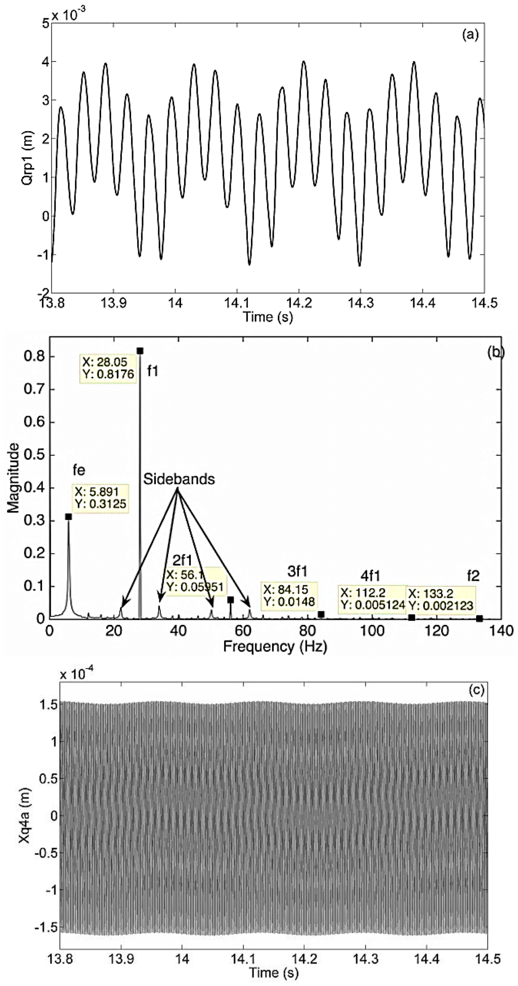 When both the internal and constant external excitations are considered, it is assumed that the turbine operates under ideal condition. The external excitation is constantly applied to the gearbox, and the internal excitation, caused by the static transmission errors , is assumed to fluctuate with the meshing frequencies . Figure 6 shows the dynamic responses of and . The internal excitation provides high-frequency vibrations to the gearbox, thus, the dynamic responses under meshing frequencies are expected to be observed.