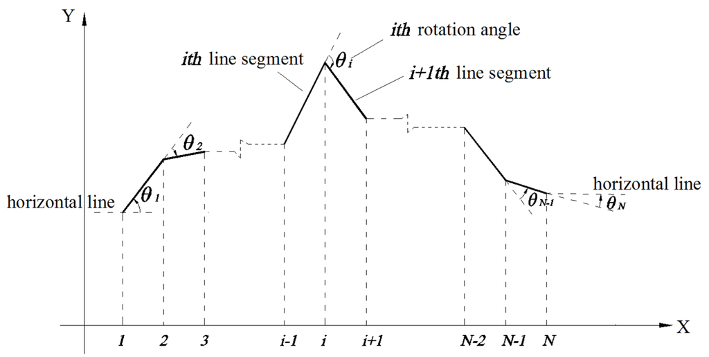 where θi is the rotation angle of the process output, as shown in Figure 1. When 2 ≤ i ≤ N−1, θi is the rotation angle between two adjacent line segments of process, while when i = 1 or N, it is the acute angle between the 1st or Nth line segment, respectively, and a horizontal line. The slope is represented by ki. When 1 ≤ i ≤ N−1 ki is the slope of the ith line segment, while when i = N, it is the slope of N−1th line segment. The symbol represents the contour variations of the process output.