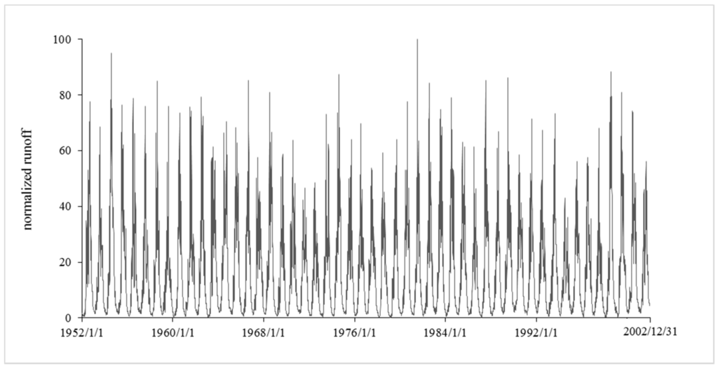 Normalized runoff process (from 0 to 100) analyzed in this research. Original data describe runoff measured at hydrologic station (location: 30°42′ N, 111°17′ E, catchment area: 1.01 × 106 km2) in central China. Resolution is 1 day and duration is 50 years.