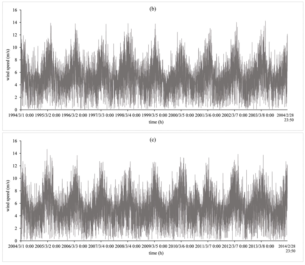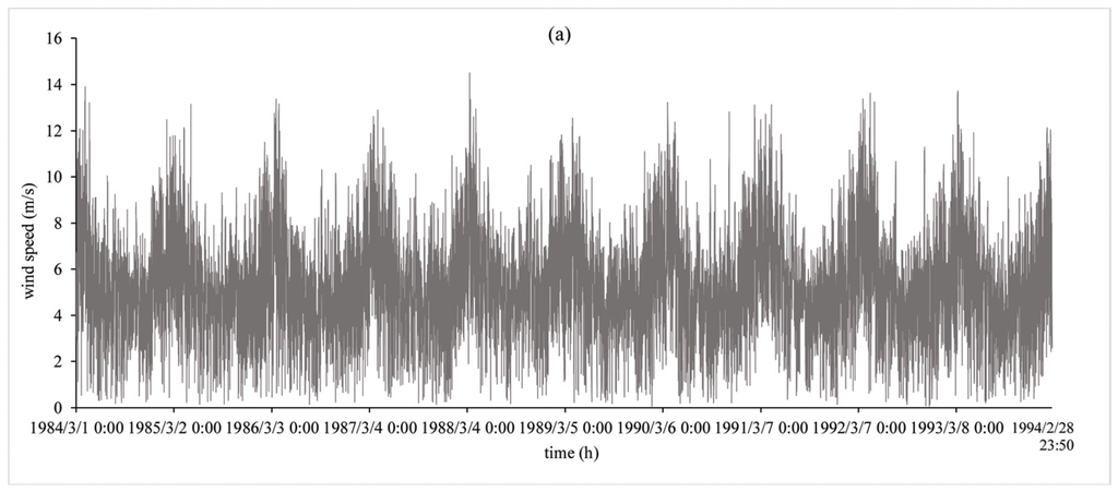 Wind speed process analyzed in this study. Data were downloaded using Modern-era Retrospective Analysis for Research and Applications [36], an application developed by NASA. Series covers Jinning region in southwestern China (24°30′ N, 102°40.13′ E) with resolution of 1 h and duration of 30 years (from 1 March 1984 0:00 to 28 February 2014 23:50). (a) The wind speed process from 1 March 1984 0:00 to 28 February 1994 23:50; (b) The wind speed process from 1 March 1994 0:00 to 28 February 2004 23:50; (c) The wind speed process from 1 March 2004 0:00 to 28 February 2014 23:50.