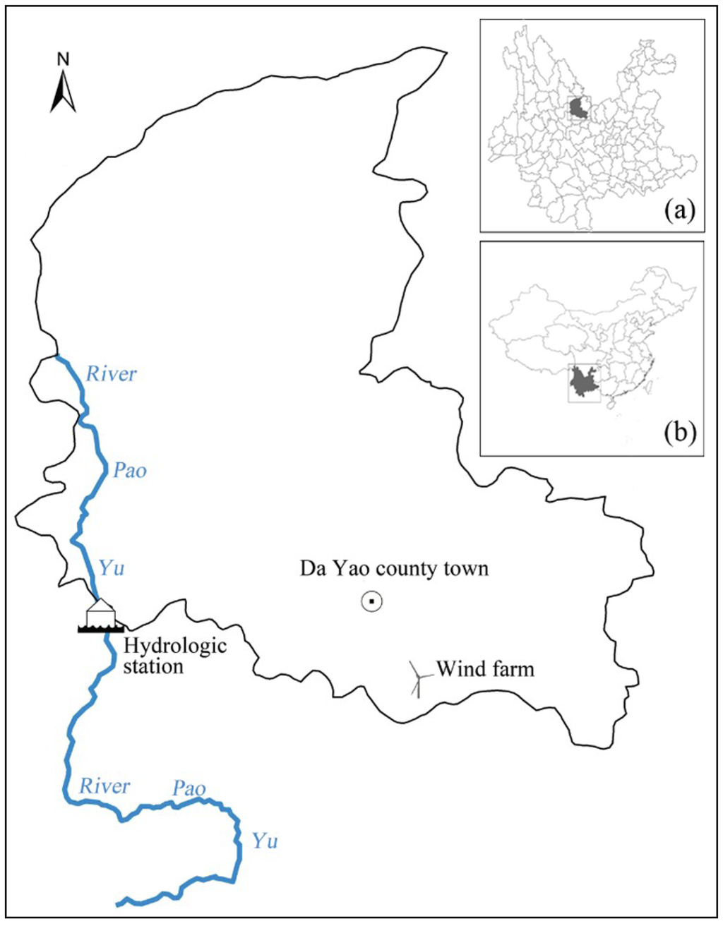 Locations of anemometer tower and hydrologic station. Anemometer tower is located in southern Dayao County in Yunnan Province, China (25°36.72′ N, 101°22.88′ E). Hydrologic station is located in western Dayao County (25°42.53′ N, 100°59.6′ E), and its catchment area is about 1950 km2. (a) the location of Dayao County in Yunnan Province; (b) the location of Yunnan Province in China.