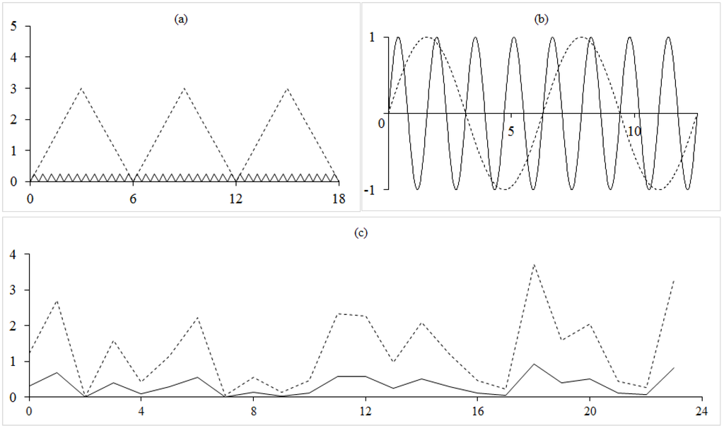 Processes for special case. (a) the zigzag processes; (b) the sine/cosine processes; (c) similar processes with different scale of ordinates.
