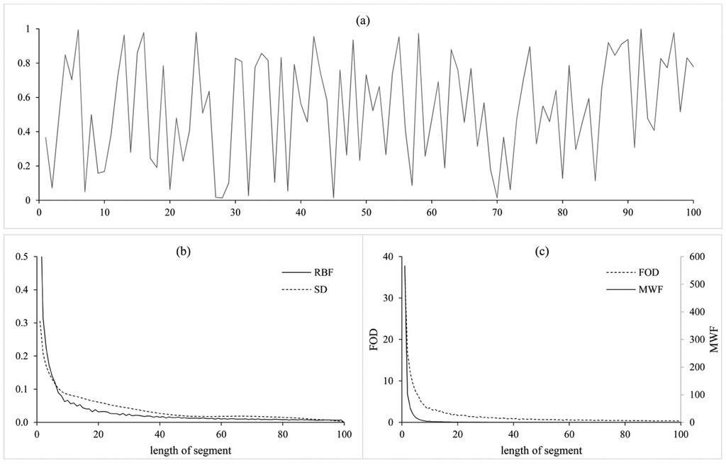 Comparison of indices with different moving average disposals. (a) a random process with 100 data points and its ordinates range from 0 to 1; (b) the RBF or SD indices of disposed process with segment length ranging from 2 to N; (c) the FOD or MWF indices of disposed process with segment length ranging from 2 to N.