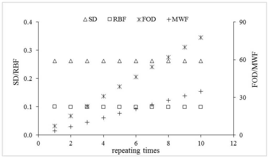 Performing the process a second time would double the fluctuations. Therefore, there is a linear relationship between the number of repetitions and the fluctuation of a process. The indices obtained for a random process (solid line in Figure 6c) with several repetitions {1, 2, 3, 4, 5, 6, 7, 8, 9, 10} are displayed in Figure 8. The SD and RBF indices remain constant, while the FOD and MWF indices increase linearly with the number of repetitions. Thus, the SD and RBF indices do not reflect the repeating fluctuations, while the FOD and MWF do.