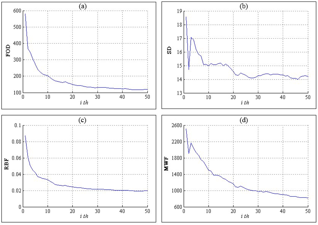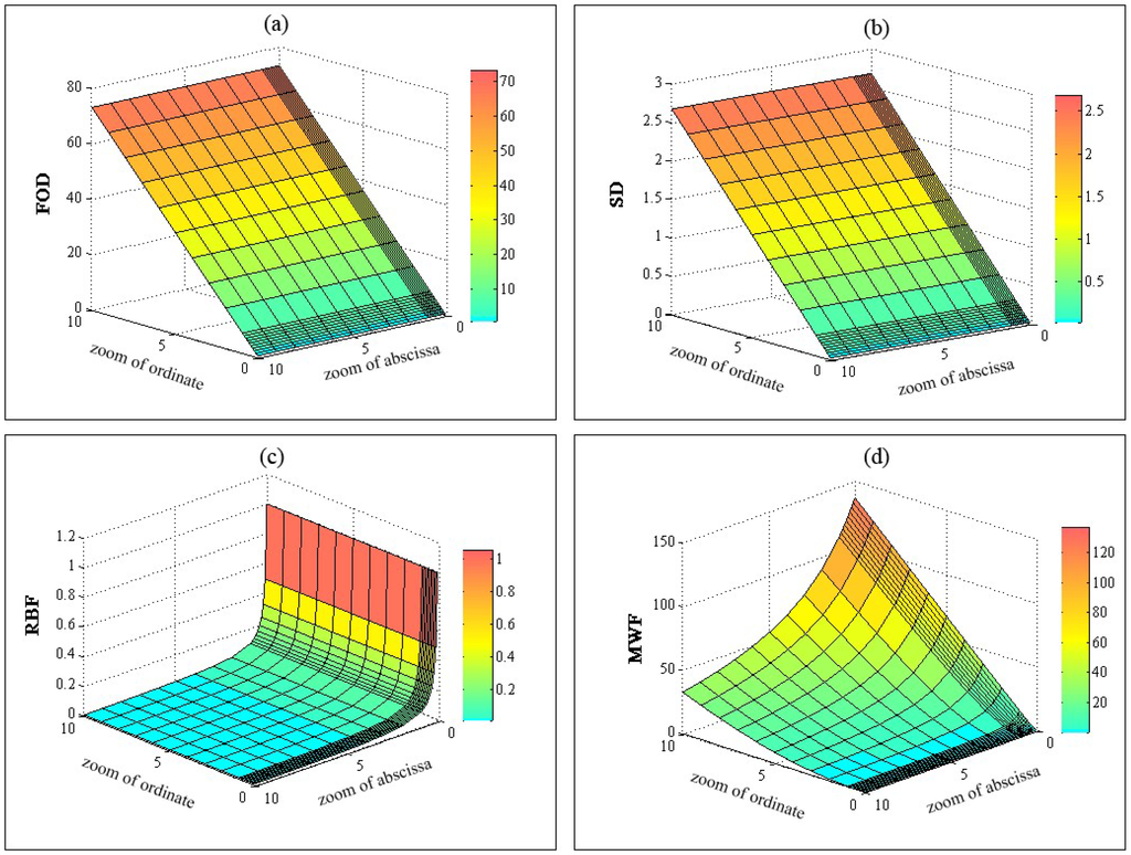 Comparison of indices with different zoom patterns. (a) the FOD index; (b) the SD index; (c) the RBF index; (d) the MWF index.