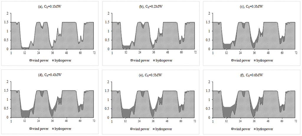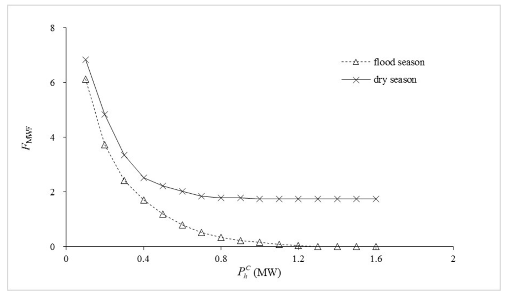 The wind power output is unadjustable. Thus, the fluctuation of the combined output FMWF(Pco) is determined by the dispatched hydropower output, which further depends on and . When is settled, FMWF(Pco) is determined by λ(i). Therefore, if is given, there is a corresponding minimum FMWF(Pco) that depends upon the optimal λ(i). The value of is limited by the hydropower capacity and available water resources. In this study, a group of hydropower capacities (from small to large) and two water resource scenarios (flood season and dry season) were analyzed. The other parameters in this model were held constant.
