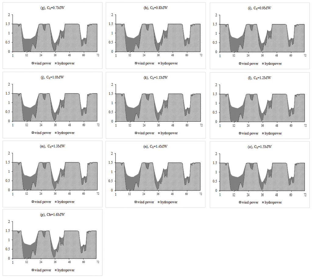Combined output with different hydropower capacities in flood season. (a) the combined output with hydropower capacities of 0.1 MW; (b) the combined output with hydropower capacities of 0.2 MW; …; (p) the combined output with hydropower capacities of 1.6 MW.