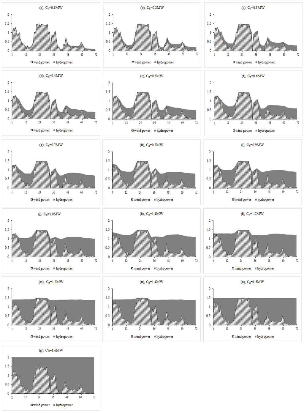 Combined output with different hydropower capacities in dry season. (a) the combined output with hydropower capacities of 0.1 MW; (b) the combined output with hydropower capacities of 0.2 MW; …; (p) the combined output with hydropower capacities of 1.6 MW.