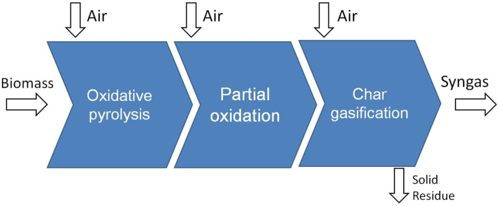 As reviewed above, oxygen supply is a key issue for biomass gasifier design. Several gasifier concepts have been developed in the past 20 years [14]. The majority of them have a single inlet for air, no matter whether it is an updraft, downdraft or fluidized gasifier. Few of them has more than one air inlet. Pan et al. [15] reported a 88.7 wt % of tar reduction by injecting secondary air above the biomass feeding point in a fluidized bed configuration. Narv et al. [16] performed secondary air injection in the freeboard of a fluidized bed gasifier and observed a tar reduction of nearly 50 wt % with a temperature rise of about 70 °C. The Asian Institute of Technology (AIT) developed a two stage biomass gasifier [7]. Experimental results showed that the tar concentration in flue gas is about 40 times less than in a single-stage reactor under similar operating conditions. This concept involves a downdraft gasifier with two air inlets. Tar produced in first pyrolysis stage will pass through a high temperature char bed and decompose at elevated temperatures. Yoshikawa [17] combined a fixed-bed pyrolyzer with a high temperature reformer using a high temperature steam/air mixture and demonstrated that the injection of high temperature steam/air mixture into the pyrolysis gas effectively decomposes tar and soot components in the pyrolysis gas into gaseous products. Henriksen et al. [18] reported successful working and operating experiences with a two-stage gasifier. Although it has only one oxygen inlet, the pyrolysis and gasification process are separated by a partial oxidation zone, where the produced pyrolysis tar can be decomposed to a great extent.