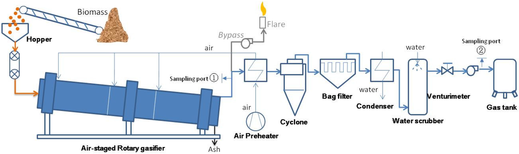 Gasification agent is provided by an air blower. Air is preheated by the hot product gas and divided into three intakes. Three flow meters are used to control each air injection separately. The air feed system for the rotary kiln type furnace is a patented technology, which ensures no air and fuel gas leakage from the rotating furnace. First air is fed into the pyrolysis region of the reactor through tuyeres placed radically around the circumference. Secondary air is injected into the secondary part of the reactor and distributed in gaseous phase area, so that partial oxidation of the pyrolytic gas would take place and oxidation of biomass char would be prevented at the bottom of the reactor. Third air is injected into the third part of reactor through nozzles located at the bottom of the reactor. This is to ensure a fine mixture of air and hot char, and hence promote the gasification reaction.